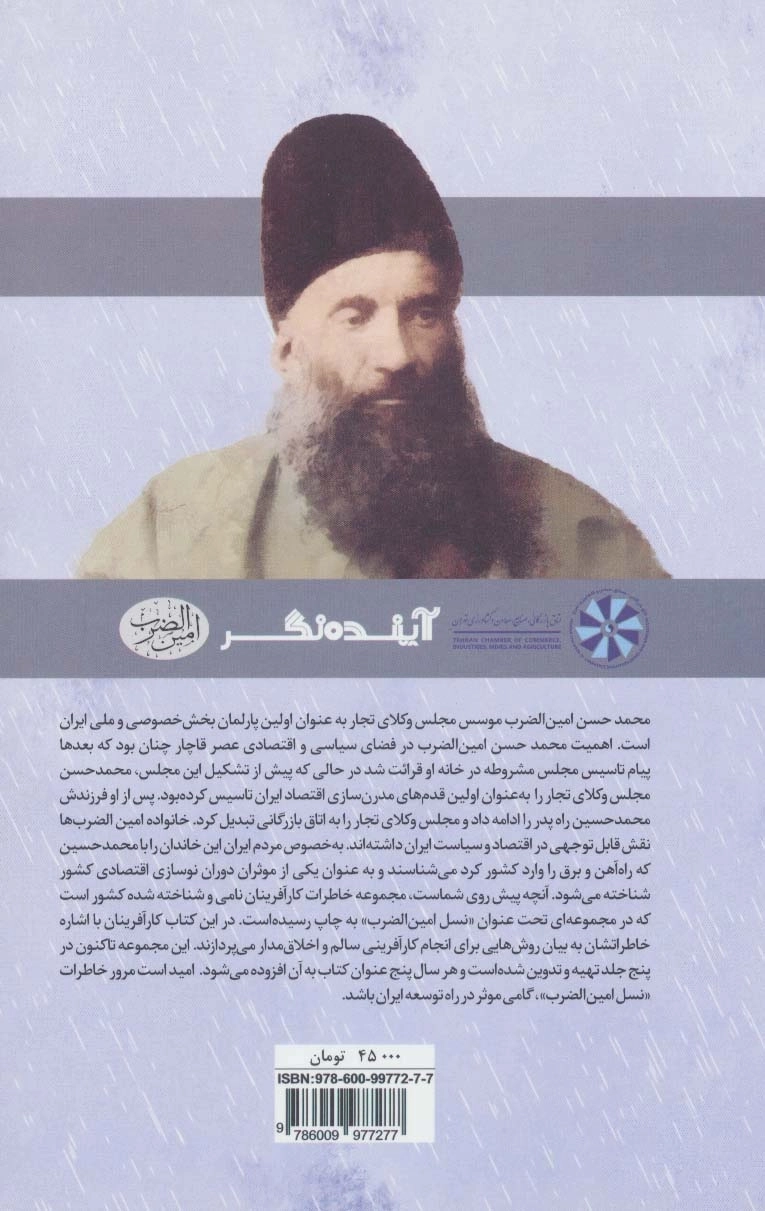 محمد حسن امین الضرب موسس مجلس وکلای تجار به عنوان اولین پارلمان بخش خصوصی و ملی ایران است. اهمیت محمد حسن امین الضرب در فضای سیاسی و اقتصادی عصر قاجار چنان بود ک بعدها پیام تاسیس مجلس مشروطه در خانه او قرائت شد در حالی که پیش از تشکیل این مجلس، محمد حسن مجلس وکلای تجار را به عنوان اولین قدم های مدرن سازی اقتصاد ایران تاسیس کرده بود. پس از او فرزندش محمد حسین راه پدر را ادامه داد و مجلس وکلای تجار را به اتاق بازرگانی تبدیل کرد. خانواده امین الضرب ها نقش قابل توجهی در اقتصاد و سیاست ایران داشته اند. به خصوص مردم ایران این خاندان را با محمد حسین که راه آهن و برق را وارد کشور کرد می شناسند و به عنوان یکی از موثران دوران نوسازی اقتصادی کشور شناخته می شود. آنچه پیش روی شماست، مجموعه خاطرات کارآفرینان نامی و شناخته شده کشور است که در مجموعه ای تحت عنوان نسل امین الضرب به چاپ رسیده است. در این کتاب کارآفرینان با اشاره خاطراتشان به بیان روش هایی برای انجام کارآفرینی سالم و اخلاق مدار می پردازند. این مجموعه تاکنون در پنج جلد تهیه و تدوین شده است و هر سال پنج عنوان کتاب به آن افزوده می شود. امید است مرور خاطرات «نسل امین الضرب» گامی موثر در توسعه ایران باشد.