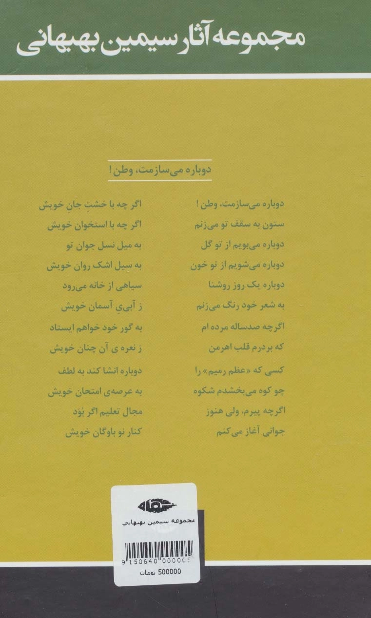 کتاب مجموعه آثار سیمین بهبهانی در سه جلد، شامل آثار برجسته این شاعر و نویسنده معاصر ایرانی است. این مجموعه توسط انتشارات نگاه منتشر شده و به صورت یک قاب نفیس عرضه میشود. جلد اول: شامل مجموعه اشعار سیمین بهبهانی جلد دوم: یاد بعضی نفرات، که به یادآوری شخصیتها و تأثیرگذاران در زندگی و کارهای او میپردازد. جلد سوم: شامل مجموعه داستانها و یادنوشتهها که ابعاد مختلف زندگی و تفکرات او را به تصویر میکشد. این مجموعه نه تنها اشعار زیبای سیمین بهبهانی را در برمیگیرد، بلکه یادداشتها و داستانهایی که از زندگی او الهام گرفته شدهاند را نیز شامل میشود. این کتاب فرصتی مناسب برای آشنایی با دنیای فکری و ادبیات غنی او فراهم میآورد. این کتاب به عنوان یک اثر ماندگار در ادبیات معاصر ایران شناخته میشود و مطالعه آن برای هر علاقمند به شعر و ادبیات ضروری است.