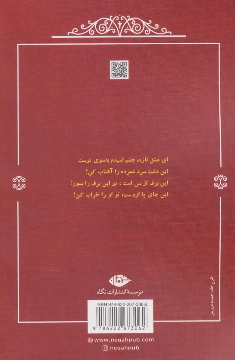 ای عشق تازه، چشم امیدم به سوی توست این دشت سرد غمزده را آفتاب کن؛ این برف از من است، تو این برف را بسوز! این جا پا آزوست، تو او را خراب کن!