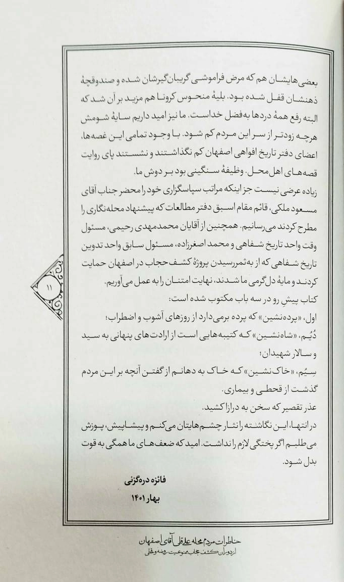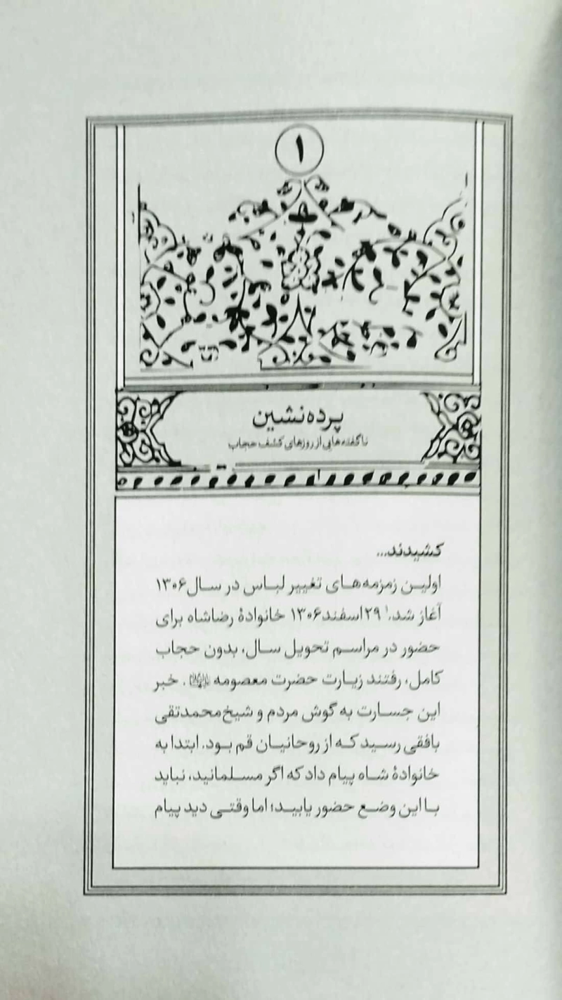 بخش اول کتاب، پردهنشین، به مسئله کشف حجاب و فشارهایی که زنان و خانوادهها برای حفظ فرهنگ ایرانی و اعتقادات دینی خود متحمل شدند، اختصاص دارد. خاطرات زنان و مردانی نقل شده که در آن دوران سخت، برای حفظ حجاب و مناسک دینی خود به شدت تحت آزار و اذیت قرار میگرفتند. این بخش نشاندهنده مقاومت مردم در برابر اجباریکردن لباس غربی و سیاستهای مذهبی رضاشاه است.