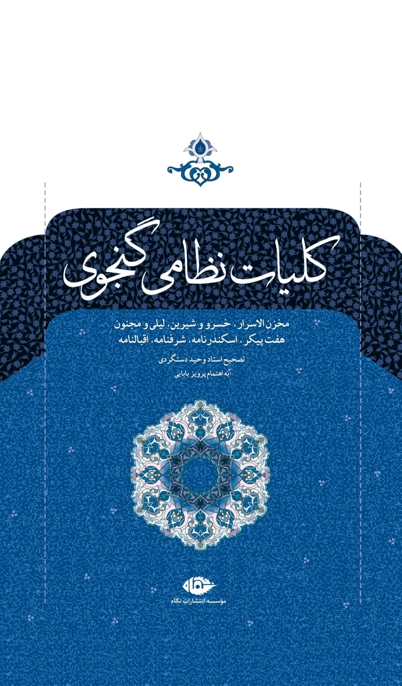 کلیات نظامی گنجوی دیوان خمسه نظامی در واقع عبارت از شش دفتر است که چون «شرف نامه» و «اقبال نامه» هر دو شامل داستان اسکندر مقدونی است و این دو منظومه را با هم اسکندرنامه نیز گفته اند، مجموعه شش دفتر را «خمسه نظامی» نامیده اند. هر یک از شش دفتر او، بنا به درخواست یکی از فرمانروایان زمان به رشته نظم درآمده است مخزن الاسرار به نام ملک فخرالدین بهرام شاه پادشاه ارزن جان به سال 552 پایان یافته است خسرو و شیرین بهنام ابوطالب طغرل ابن ارسلان پادشاه سلجوقی و اتابک شمس الدین ابوجعفر محمد ایلدگز ملقب به جهان پهلوان و برادر وی اتابک قزل ارسلان در حدود 573 آغاز و در 576 پایان یافته است لیلی و مجنون به خواهش ابوالمظفر شروان شاه که از نسل بهرام چوبین بوده است گفته شده و سرودن آن فقط چهار ماه به طول انجامیده و در 585 هجری پایان پذیرفته است .هفت پیکر که آن را «هفت گنبد» و «بهرام نامه» نیز نامیده اند، به نام سلطان علاءالدین کرپارسلان در حدود 593 هجری انجام یافته است . شرفنامه را به خواهش اتابک اعظم ملک نصرالدین ابوبکر سلجوقی فرزند اتابک محمد جهان پهلوان سروده ولی تاریخ آغاز و انجام آن معلوم نیست اما از قرار پس از 593 هجری به نظم درآمده است. اقبال نامه یا خردنامه به نام ملک عزالدین محمود بن ارسلان سلجوقی پادشه موصل است. نظامی اقبالنامه را در سال 599 هجری توسط یگانه فرزندش محمد نزد ملک عزالدین فرستاده است.