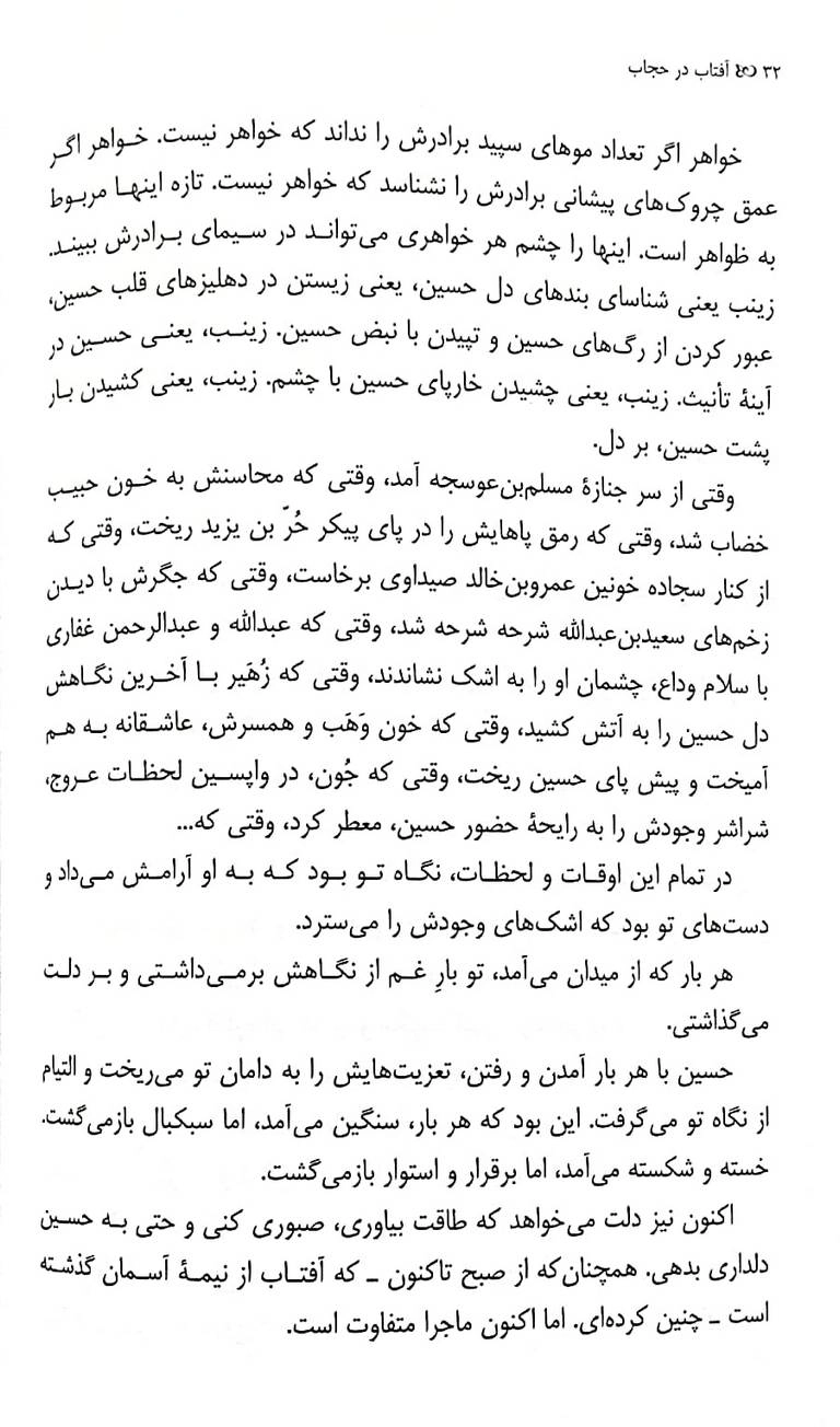 کتاب آفتاب در حجاب روایتی است از زندگی حضرت زینب. از کودکی تا عاشورا تا اسارت و تا وفات. اثری که ماندگاریاش از حال پیداست. رمانی که به پشتوانه تحقیقات دقیق و عالمانه تاریخی و روایی، به همه زوایای پنهان و آشکار زندگی و رفتار و درونیات حضرت زینب پرداخته است. شجاعی زبان روایتش را توی مخاطب انتخاب کرده، راوی دانای کلی است نامحدود که در تمام روایت حضرت زینب را مخاطب قرار داده و روایتش را پیش میبرد. فرمی که در ادبیات داستانی ایران نمونهاش کمتر دیده شده. داستان از کابوس حضرت زینب در کودکی آغاز میشود: چشمهای اشکآلودت را به پیامبر دوختی، لب برچیدی و گفتی: «خواب دیدم، خواب پریشان دیدم. دیدم که طوفان به پا شده است، طوفانی که دنیا را تیرهوتار کرده است. طوفانی که مرا و همه چیز را به اینسو و آن سو پرت میکند، طوفانی که چشم به بنیان هستی دارد. ناگهان در آن وانفسا چشم من به درختی کهنسال افتاد و دلم به سویش پرکشید…» داستان از این کابوس که گواه رحلت پیامبر است و شهادت مادر و پدر و… آغاز میشود و در انتهای کتابباز به همین خواب پریشان میرسیم: «تعبیر شد خواب کودکیهای من پیامبر! و من اکنون با یک دنیا مصیبت و غربت تنها ماندهام…» کتاب آفتاب در حجاب را انتشارات نیستان منتشر کرده است.